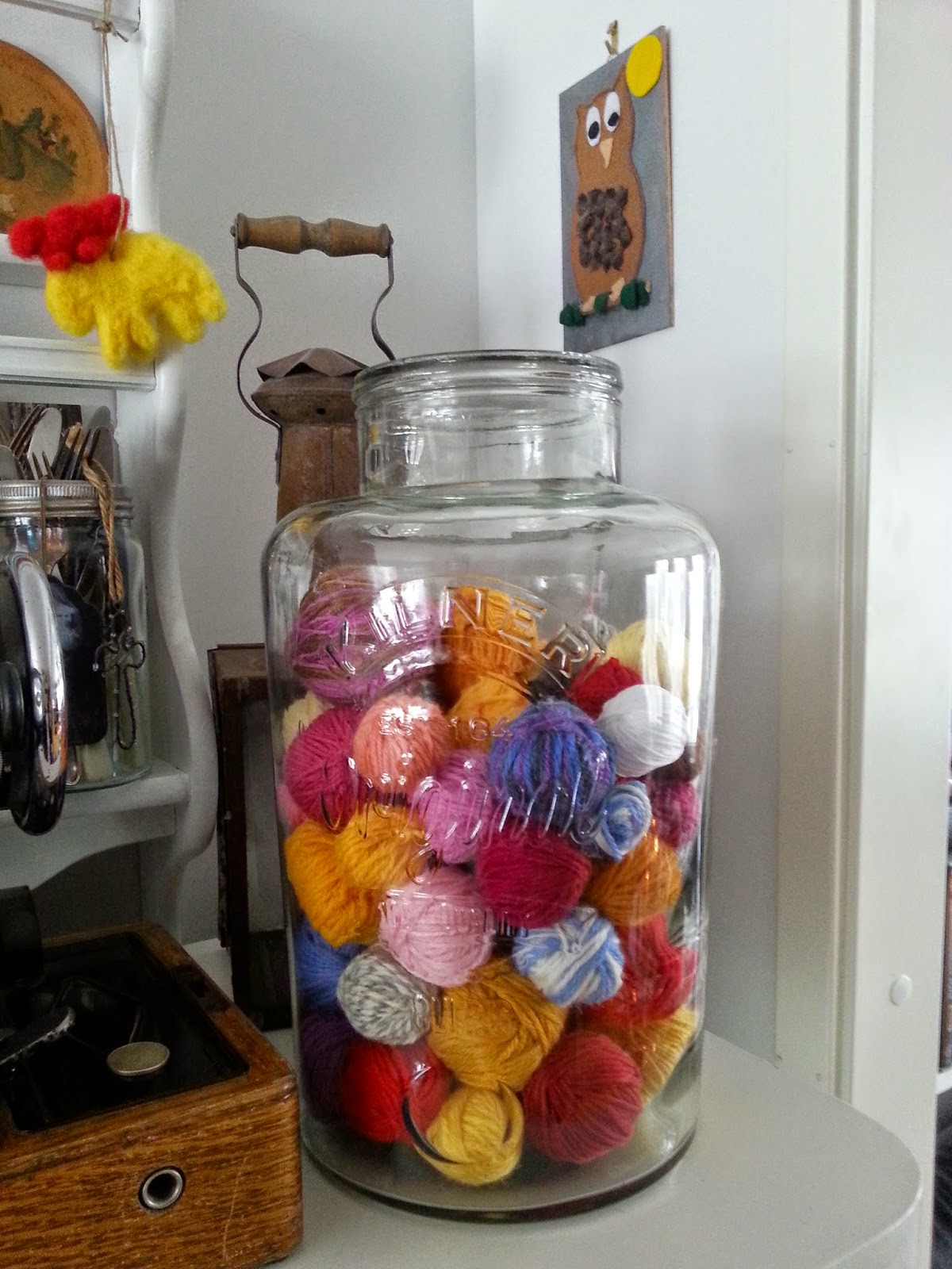 Put my wool scraps in a huge glass jar, rather pretty l thought. My eldest son thought it looked like a jar of brightly coloured sweets :)